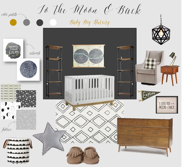 I am SO excited to finally have a clear vision of what we both want in the nursery design and can finally start buying items and putting this room together! Other than the moon and stars theme in the nursery, I really want his nursery to have a cool, masculine look with mid-century furniture and a whimsical bohemian feel. This nusery below is one I found online while looking for inspiration and everything about it just exudes the feeling I am after for this nursery!